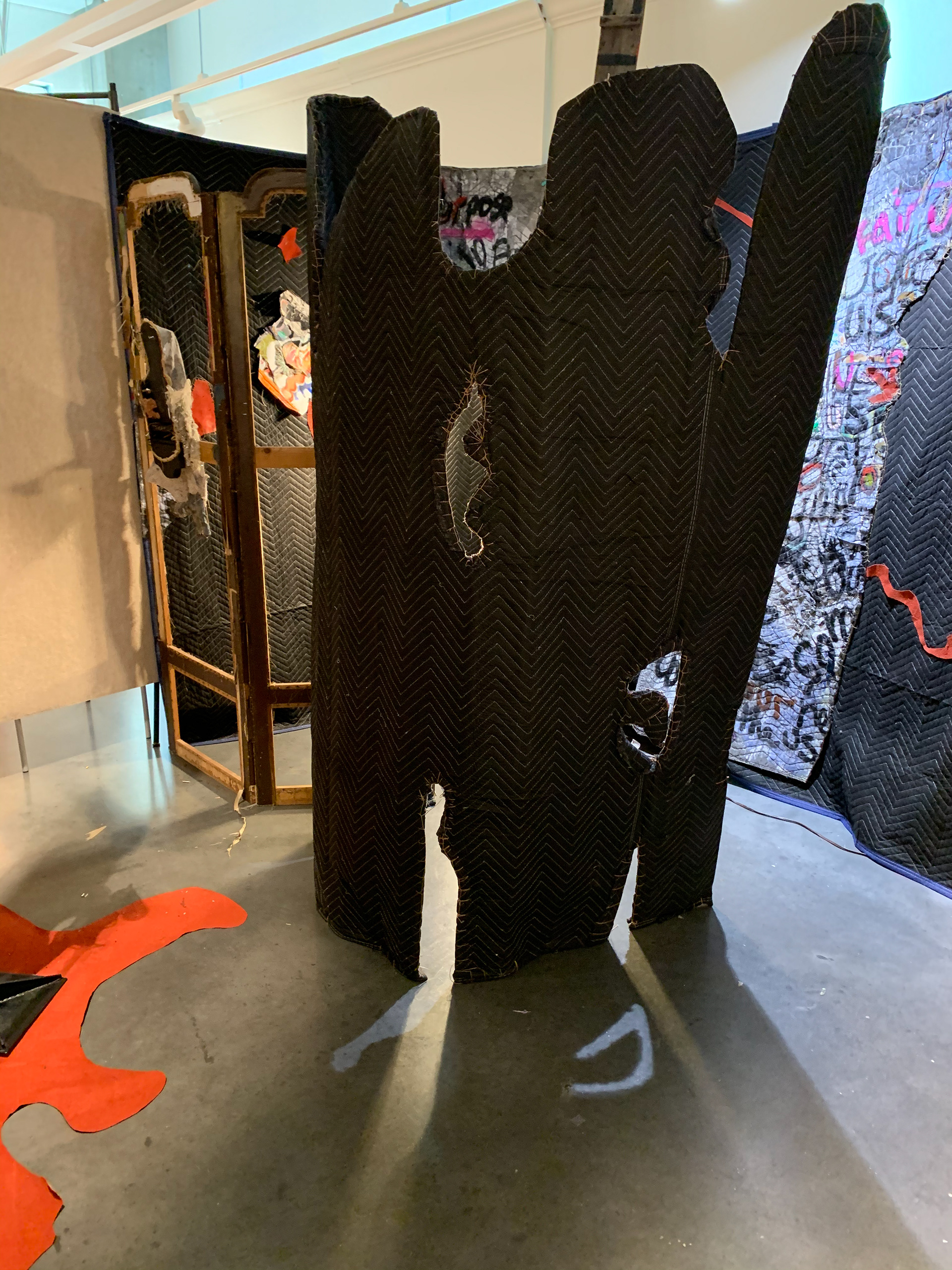 I like to think of my artistic practice as a type of provocation, a sort of dangerous question that can disrupt and transform my own, and hopefully others, long held beliefs, perceptions and concepts. My work is about working with the unknown, the lost, denied, repressed, or just the unconscious aspects of our mind and human life. I am interested in exploring, naming and bringing to light all the aspects of our ordinary/extraordinary human life in all its messiness, horror and beauty. My aim is transformational, to transform both my own pain, confusion and blindness as well as others, into a greater sense of wisdom, peace and connection - a type of radical inclusivity. My work generally starts with a question that I wrestle/live with and I see what arises in my everyday life and materials in response to that. In this installation the phrase I worked with was "Go Back To Where You Came From." During the process certain objects reached out to me and I was drawn to transform them into the 'weave' of the experience. Often materials and people will be incorporated in a collaborative way. This work is the genesis of a collaboration with the sound poet Melissa Silva who created a sound poem, a type of lament for the piece. It evokes a sense of going back in time, or a trip to the land of the dead, a visit to ancestors and the past in order to gain wisdom and be released from a burden. When working with a question I create a container in my mind of the question, and let everything arise in life as a response or engagement with that question. One might think of the container more as a form of holding, and less in the sense of a restriction; as a cup holds tea for the body’s nourishment. Alchemy also has significance in this metaphor where you contain certain ingredients together and ‘heat’ them over time to allow for them to transform - base into gold. For example, in this installation the question I worked with is “go back to where you came from.” I would hold the question in my mind and let it dialogue with my everyday activities and life. When I was washing dishes, I might say to the dishes, “go back to where you came from!” And then I would allow the dishes to respond and tell me the story of where they came from, how they came into being. Also, I love to forage around dumps, used furniture stores, salvage areas, and see what objects resonate with the question - which objects call out to be picked up and rescued from obsolescence, from the debris heap? I bring them back to my studio and set them up somewhere. I have no idea how they will work with the piece, I trust that they belong somewhere, or will help me or be important in some small or large way. They are like a type of ancestor or guide or mentor. A bit of the universe reaching out to help me see some hidden area of life or of my unconscious, or of the collective unconscious of the world. Often the question will evoke a sound, melody or images spontaneously, and I will incorporate that sensibility into the work. I work blind, I don’t know what I am really doing, except that I keep holding the question and trust that, as Kiki Smith says, “If I take care of my art, it will take care of me”. Sometimes I reach out to others to work on the question with me and ask to collaborate, as perhaps with a sound poet, musician or dancer. It is a dangerous voyage into the unknown as I don’t know how the question will transform me or my relationship with the world, but I know that I want it to transform me in a profound sense of mutuality. I am also very interested in the idea of mundane, overlooked labor, especially of women and the idea of deep time. Much of my work involves labor intensive practices such as sewing. I feel the idea of repeated, everyday ‘touch’ to be important, but not the touch of a stroke of genius, but one of utter ordinariness. Furthermore, a repetitive, laborious, mundane, tasks like sewing is ripe for losing one’s mind in a sense of timelessness. I hope that when one enters the space of my work there is a certain activation of this feeling of deep time, of a voyage asked to be taken, and a question that might be dangerous and liberating all at the same time.
